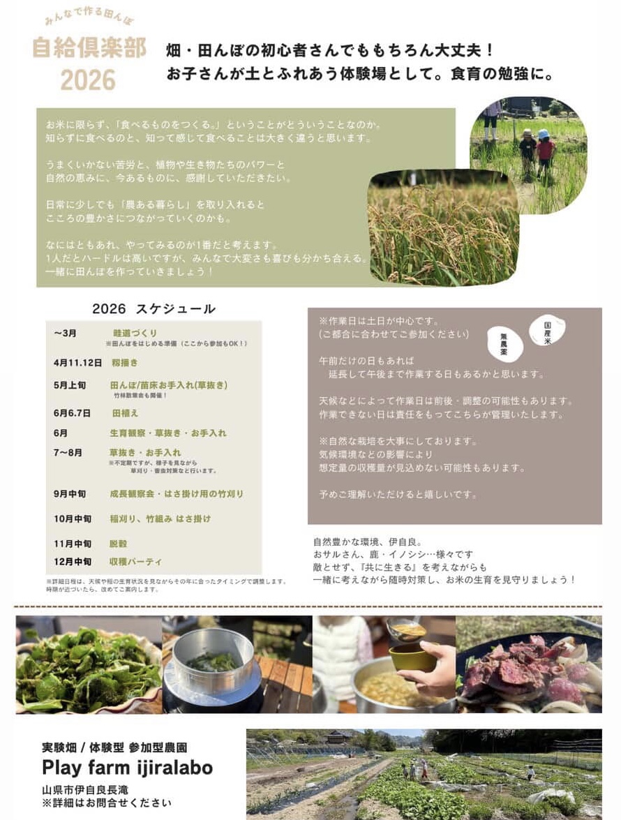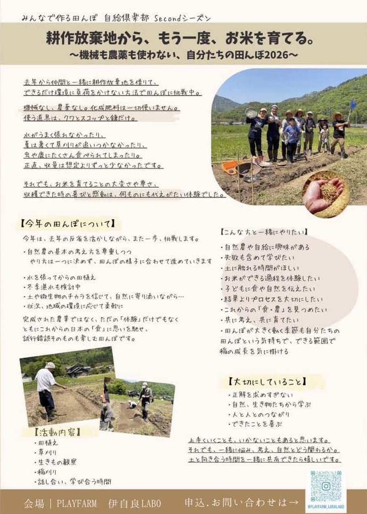 1年を通して1から田んぼを参加者で育み、収穫し、食べるまでを体感し大変さも喜びも分かち合います。