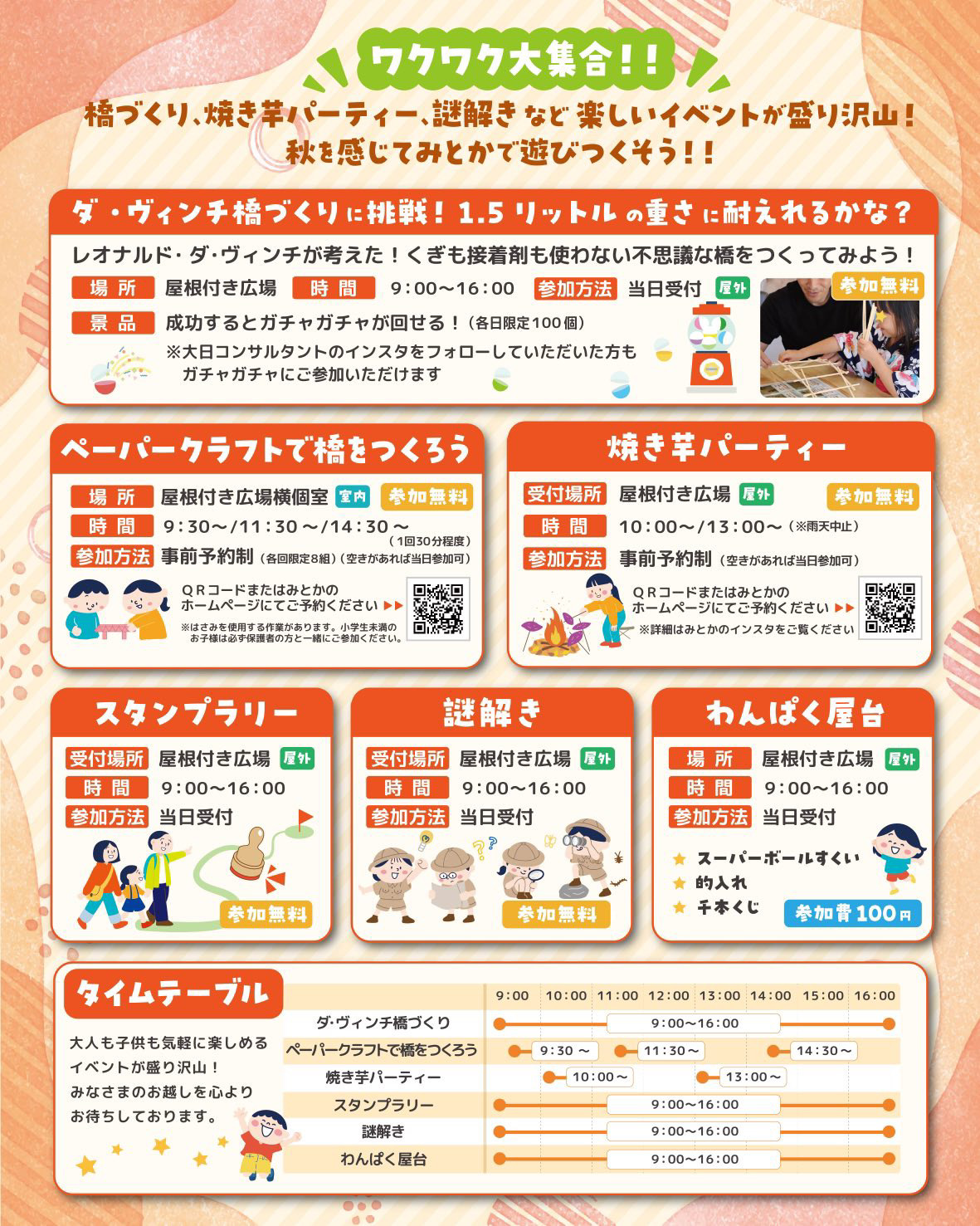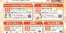 ダ・ヴィンチ橋づくり/ペーパークラフトで橋をつくろう/焼き芋パーティー/スタンプラリー/謎解き/わんぱく屋台(的入れ・スーパーボールすくい・千本くじ)