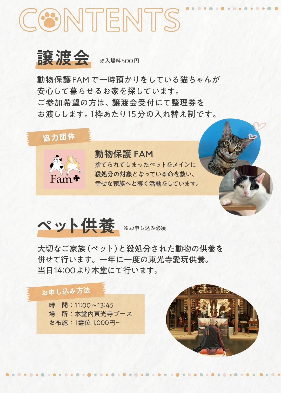 ●参加費 / イベント入場無料 / 譲渡会 : 入場料500円 / ペット供養 : お布施:1霊位 1,000円~ 【譲渡会協力団体 : 動物保護FAM】