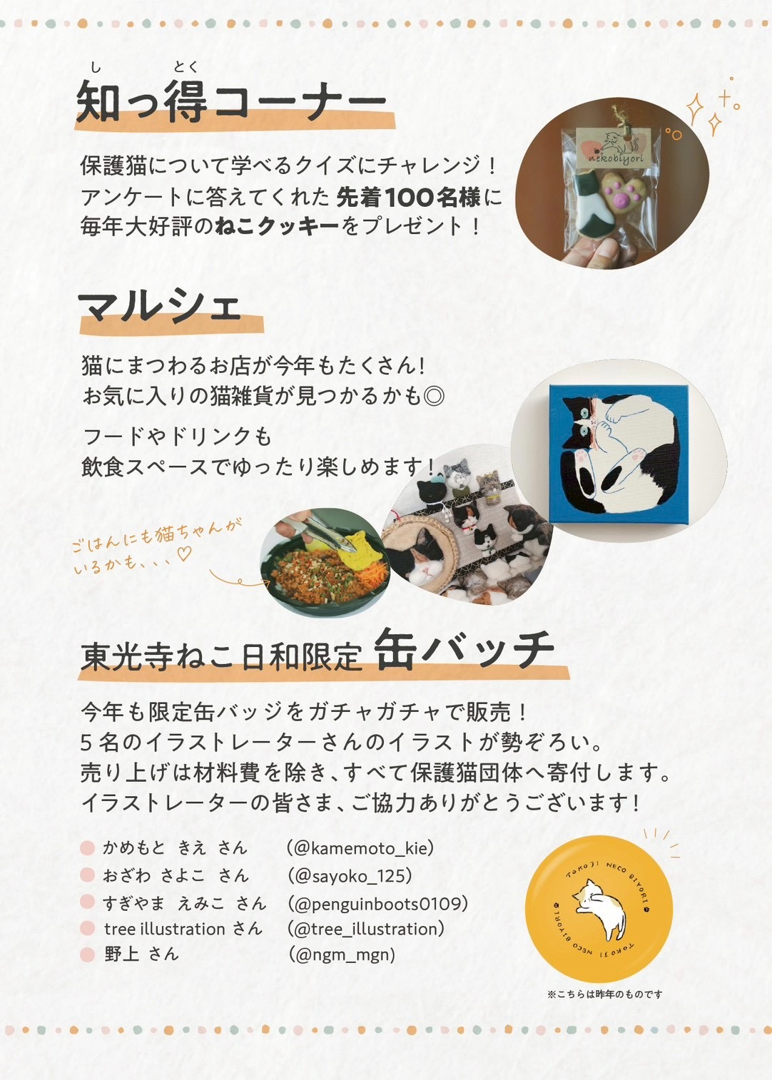 譲渡会、マルシェ、ペット供養、ねこクイズ、フォトブースなどを実施します。