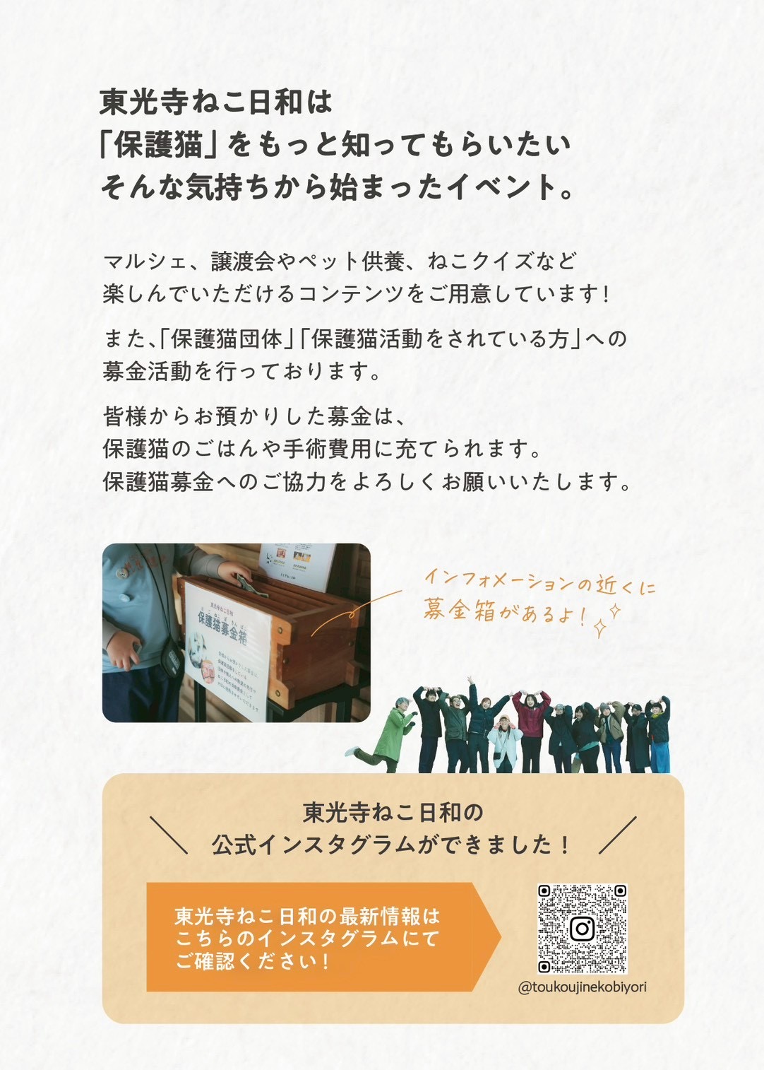 会場に募金箱を設置し、保護猫活動団体や保護猫の援助に活用します。